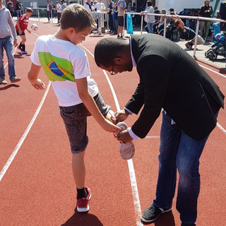 Unsere Cusanus-Grundschule stellte 2 Teams (Team Senegal und Team Brasilien), die gegen 6 weitere Schulteams antreten mussten. Ein Höhepunkt war sicherlich die Anwesenheit von Cacau, ehemaliger Fußballprofi und DFB Integrationsbeauftragter. Dieser überreichte auch im Anschluss bei der Siegerehrung Medaillen & Anstecker und verteilte fleißig Autogramme.